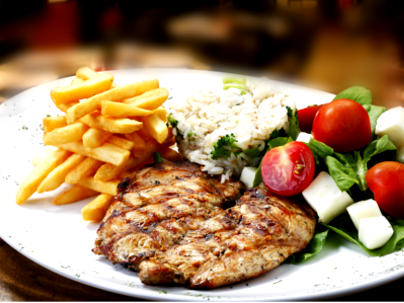 Peito de frango panado c/ batata frita e salada